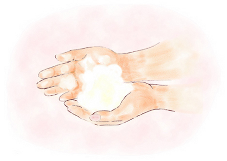 「陶泡石けん」をのせ、しっかり泡立てます。しっかりとした泡が出来たら、 お肌を穏やかになで洗いします。